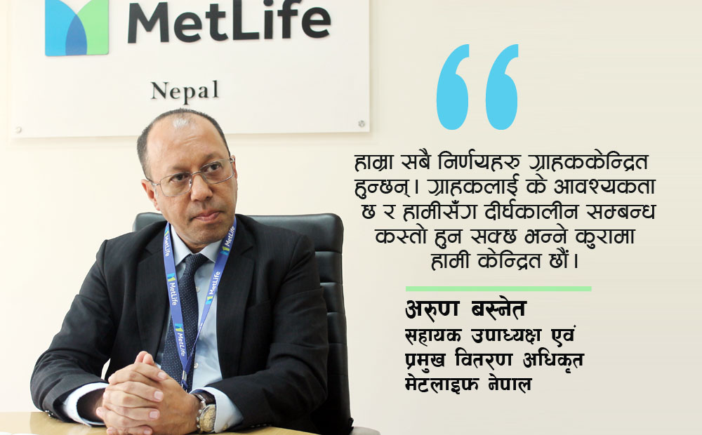 मेटलाइफ दुःखको साथी हो । हाम्रो मुख्य नारा भनेको ‘सधैं तपाईंको साथ, एक अधिक आत्मविश्वासी भविष्य निर्माण गर्दै’ हो । हाम्रा सबै निर्णयहरु ग्राहककेन्द्रित हुन्छन् । ग्राहकलाई के आवश्यकता छ र हामीसँग दीर्घकालीन सम्बन्ध कस्तो हुन सक्छ भन्ने कुरामा हामी केन्द्रित छौं । हामी असाधारण ग्राहक सेवामा विश्वास गर्छौं । समयबोध म्यागेजिनको माघ अंकबाट ।