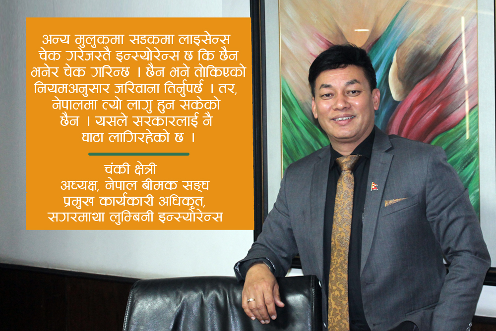 बीमा सरकारले अनिवार्य गरेपछि मात्रै हुने कि जस्तो भइरहेको छ । तर, बीमाका लागि सरकारको मात्रै मुख ताक्नु हुँदैन । नेपालमा जति सङ्ख्यामा यातायातका साधन भित्रिएका छन्, यातयात साधनको सङ्ख्याको तुलनामा इन्स्योरेन्स न्यून छ । झण्डै ५० प्रतिशत पनि छैन होेला । गाडीको सङ्ख्याअनुसार इन्स्योरेन्स गरिएको छैन । यसले सरकारलाई घाटा लागिरहेको छ । राजस्वमा कमी आएको छ । समस्या कस्तो छ भने मोटरसाइकल वा गाडी किन्दा पहिलोचोटि इन्स्योरेन्स गर्छ, दोस्रोचोटिदेखि गर्दैन । यसलाई सरकारले वर्षेनी नवीकरणका लागि अनिवार्य गर्नुपर्छ । यसो भयो भने इन्स्योरेन्सको दायरा स्वतः बढ्छ । बाहिरी मुलुकमा सडकमा लाइसेन्स चेक गरेजस्तै इन्स्योरेन्स छ कि छैन भनेर चेक गरिन्छ । छैन भने तोकिएको नियमअनुसार जरिवाना तिर्नुपर्छ । तर, नेपालमा लागु भएको छैन । सरकारले बीमा अनिवार्य गर्नुपर्ने नियम बनाइदिनुपर्छ । त्यसो भयो भने रिक्स कभर पनि सजिलै हुन्छ । व्यापारको दायरा स्वतः बढ्छ । व्यापार बढेसँगै राजस्वमा स्वतः वृद्धि हुन्छ । यसमा सरकारले ध्यान देओस् भन्न चाहन्छौं ।