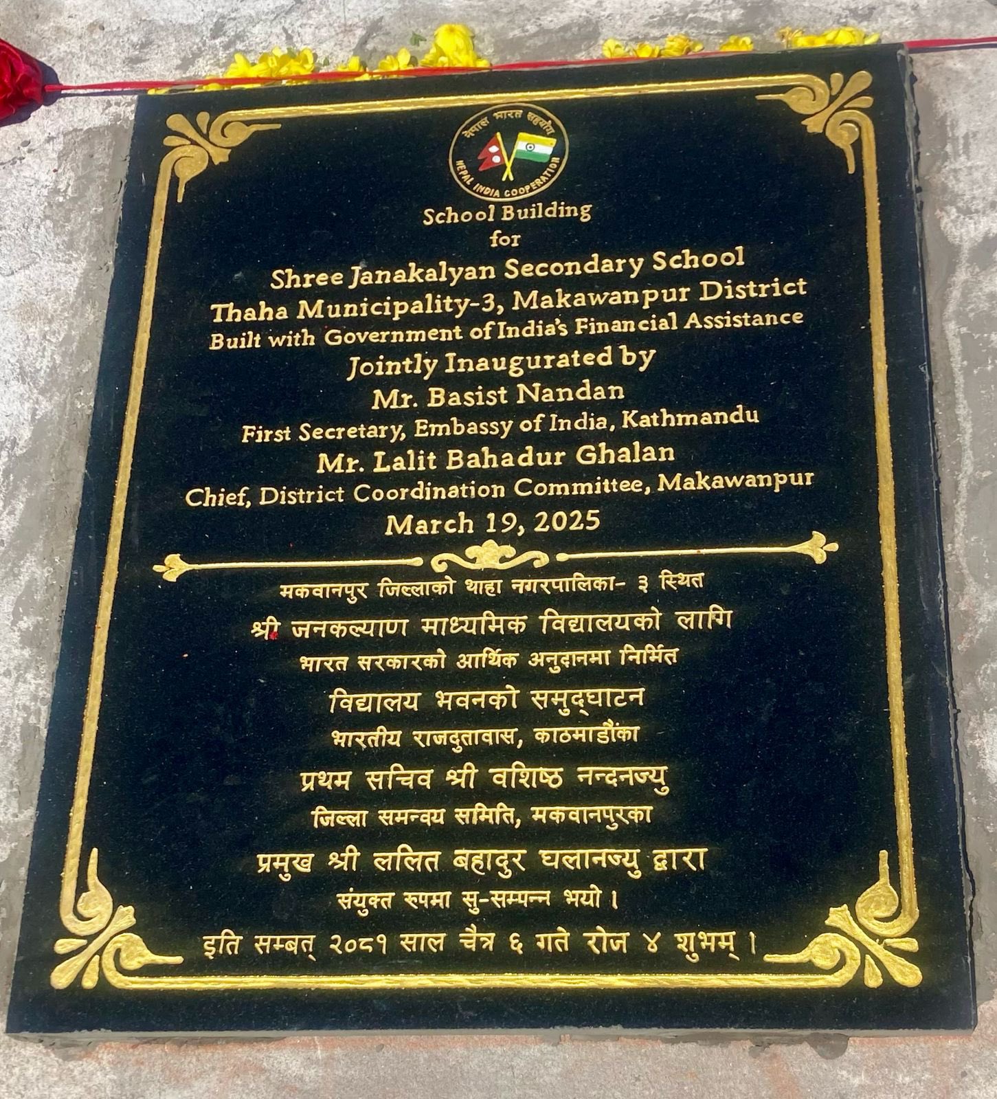 भारत सरकारको आर्थिक सहयोगमा नेपाल-भारत विकास सहकार्यअन्तर्गत ३ करोड नेरुको लागतमा निर्मित मकवानपुरको श्री जनकल्याण माध्यमिक विद्यालयको भवनको उद्घाटन आज भएको छ। मकवानपुर जिल्ला समन्वय समितिका प्रमुख ललित बहादुर घलान र भारतको काठमाडौंस्थित दूतावासका प्रथम सचिव बसिस्ट नन्दनले संयुक्त रूपमा उद्घाटन गरेका हुन्। उद्घाटन समारोहमा राजनीतिक प्रतिनिधि, सरकारी कर्मचारी, समाजसेवी, शिक्षक, विद्यार्थी र अभिभावकहरूको उपस्थिति रहेको थियो।