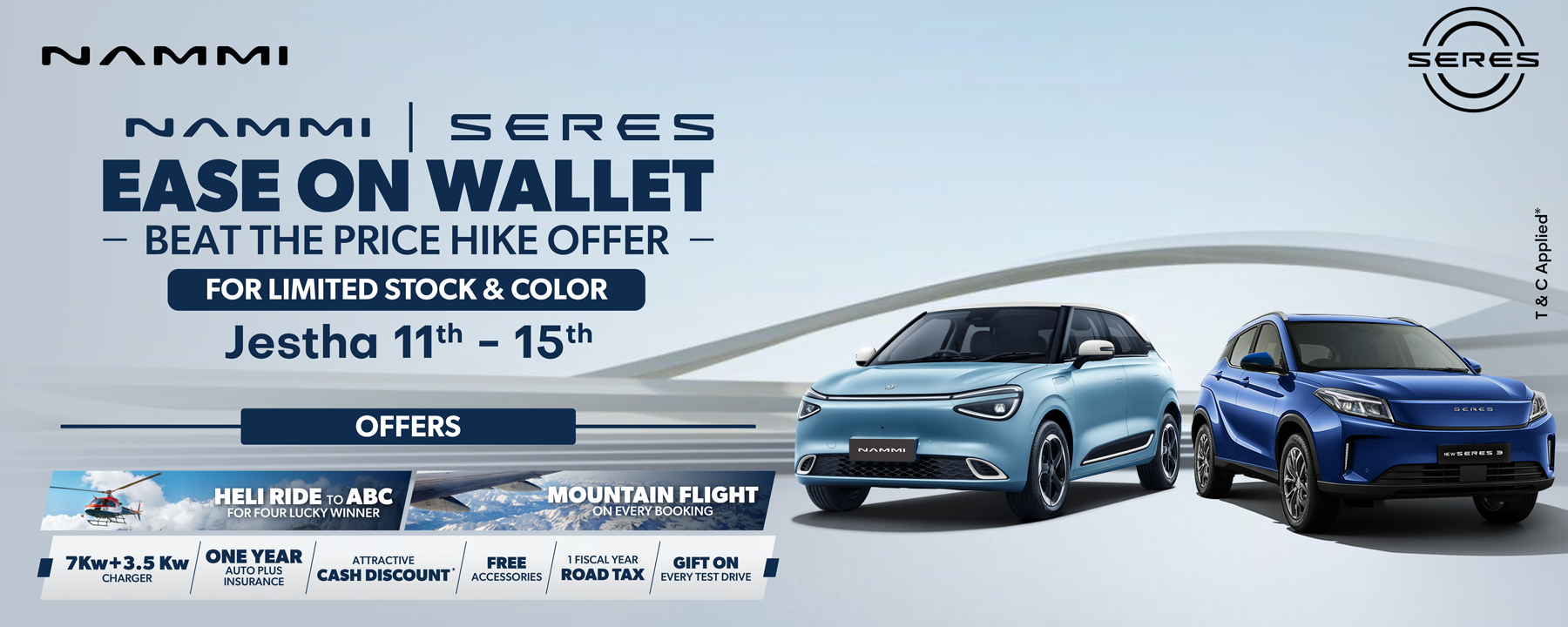 यो अफर सीमित समयको लागि मात्र मान्य छ। इच्छुक ग्राहकहरूलाई मूल्य बढ्नु अघि आफ्नो नजिकको नामी र सेरेसको शोरूम वा अधिकृत डिलरमा गई यी विशेष सुविधाहरूको लाभ लिन सक्नेछन् ।