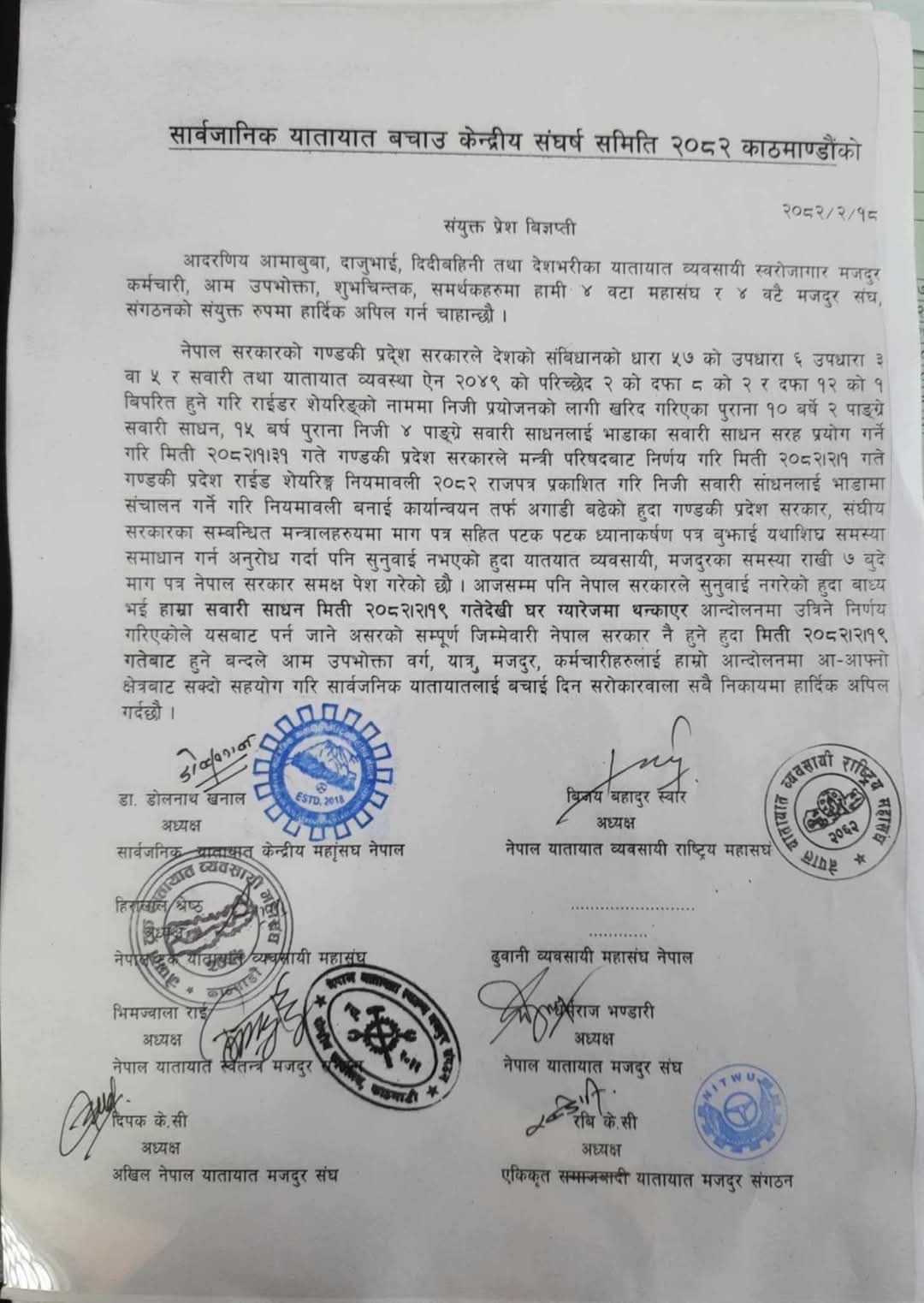‘सार्वजनिक यातायात बचाउ केन्द्रीय संघर्ष समिति’को आह्वानमा नेपाल यातायात स्वतन्त्र मजदुर संगठनले सार्वजनिक यातायातका सवारी साधनहरू ग्यारेजमा थन्क्याएर आन्दोलन गर्ने निर्णय गरेको छ।