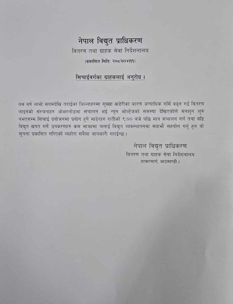 प्राधिकरणका अनुसार, सुख्खा खडेरी र अत्यधिक गर्मीका कारण तराई क्षेत्रमा विद्युत खपत बढेको छ, जसले वितरण प्रणालीमा दबाब परेको छ। यस अवस्थामा विद्युत व्यवस्थापनमा सहयोग पुर्याउन बढी विद्युत खपत गर्ने उपकरणहरू कम प्रयोग गर्न र सिँचाइ मोटरहरू राति ९ बजेपछि मात्र सञ्चालन गर्न प्राधिकरणले अनुरोध गरेको छ।