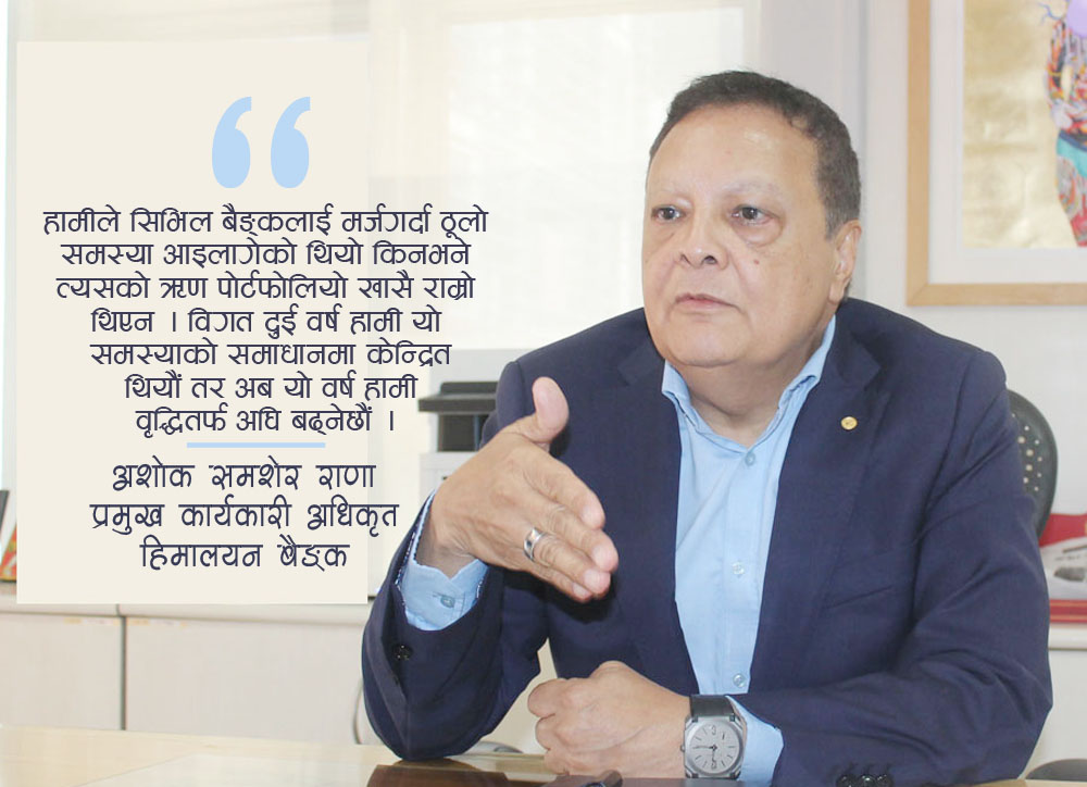हिमालयन बैङ्कको अवस्था ठिकै छ । हामीले सिभिल बैङ्कलाई मर्ज गर्दा ठूलो समस्या आइलागेको थियो किनभने सिभिल बैङ्कको ऋण पोर्टफोलियो खासै राम्रो थिएन । यो समस्या समाधान गर्न हामीलाई समय लागिरहेको छ । मैले पहिले पनि भनेजस्तै, यस्ता समस्याको समाधानमा करिब ५०० दिन लाग्छ । हामीले प्रत्येक ऋण फाइलको गहन अध्ययन गरी, साना–साना विवरणहरुमा ध्यान दिँदै अधिकांश प्रोभिजनिङ पूरा गरिसकेका छौं । अब हामी रिकभरी प्रक्रियामा जुटेका छौं र सामान्य व्यवसायमा फर्किंदैछौं । विगत दुई वर्ष हामी यो समस्याको समाधानमा केन्द्रित थियौं तर अब यो वर्ष हामी वृद्धितर्फ अघि बढ्नेछौं । समयबोध म्यागेजिनको भदौं अंकबाट ।