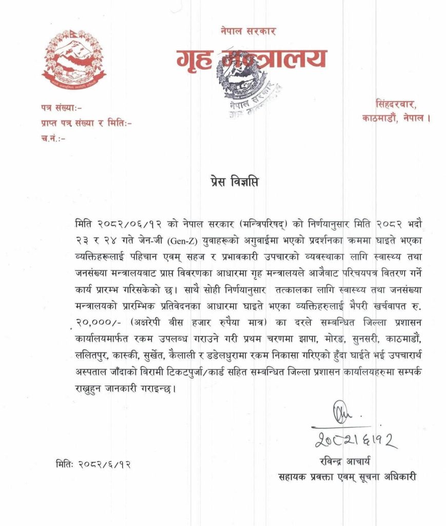 जेनजी आन्दोलनका घाइतेलाई परिचय पत्र, ९ जिल्लामा २० हजारका दरले पहिलो चरणको रकम निकासा