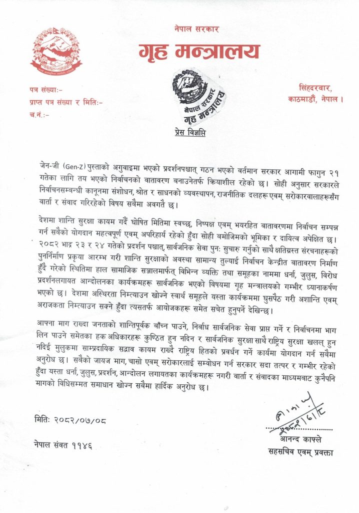 गृह मन्त्रालयका सहसचिव एवं प्रवक्ता आनन्द काफ्लेद्वारा जारी प्रेस विज्ञप्तिमा निर्वाचनकेन्द्रित वातावरण निर्माण हुँदै गरेको स्थितिमा हाल सामाजिक सञ्जालमार्फत् विभिन्न व्यक्ति तथा समूहका नाममा आन्दोलनका कार्यक्रमहरू सार्वजनिक भएकोमा गम्भीर ध्यानाकर्षण भएको जनाइएको छ।