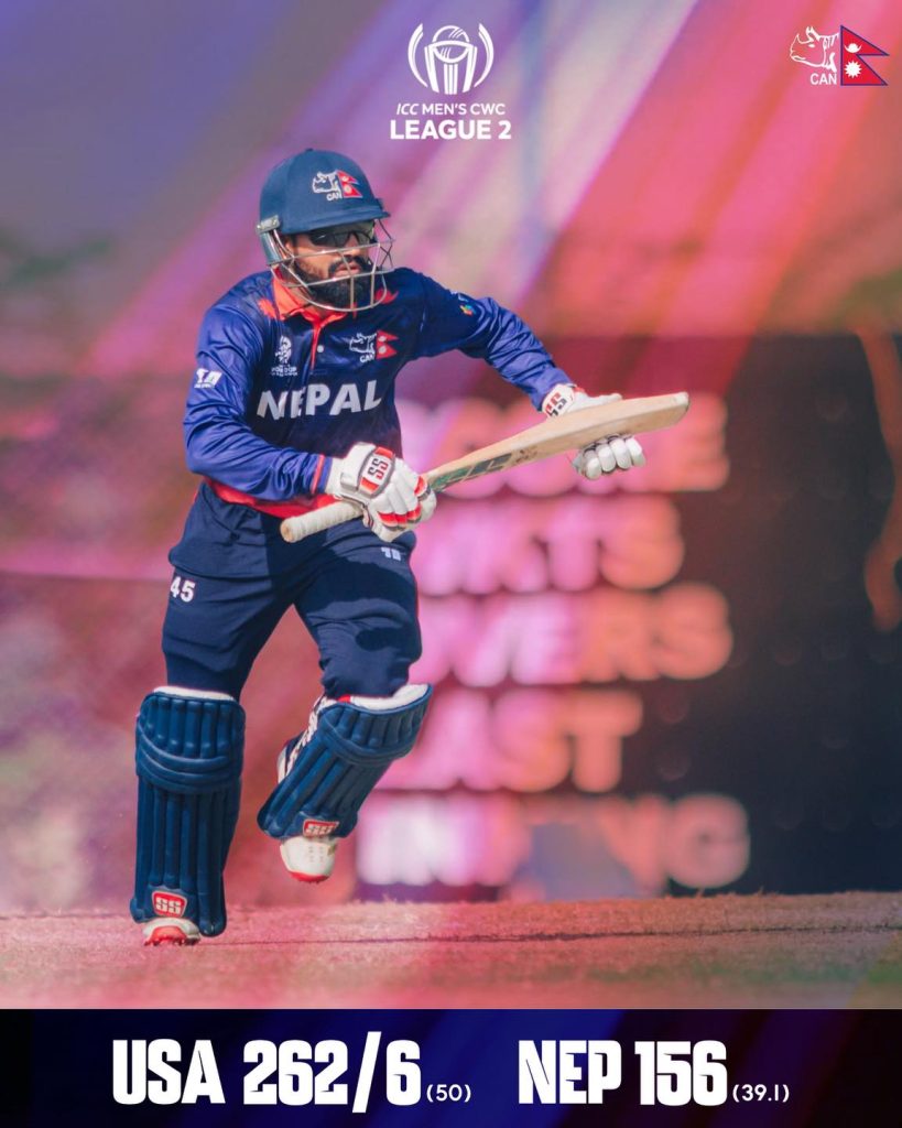 अमेरिकाले प्रस्तुत गरेको २६३ रनको लक्ष्य पछ्याएको नेपाल ३९ दशमलव एक ओभरमा सबै विकेट गुमाउँदै १५६ रनमा समेटियो ।