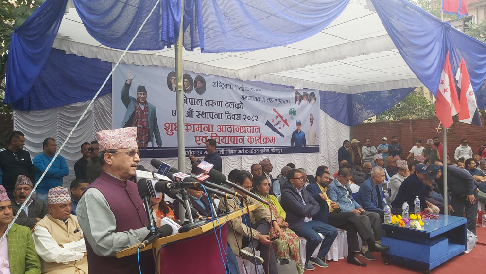 नेपाल तरुण दलको ७३औँ स्थापना दिवसका अवसरमा नेपाली कांग्रेसको केन्द्रीय कार्यालय सानेपामा आज आयोजित शुभकामना आदानप्रदान एवम् चियापान कार्यक्रममा उहाँले नेपाल इतिहासकै प्रतिकूल अवस्थामा उभिएको र कांग्रेस पार्टीसमेत प्रतिकूल अवस्थामा रहेको उल्लेख गर्दै देश जोगाउन सङ्कल्पसहित अगाडि बढ्न आग्रह गर्नुभयो ।