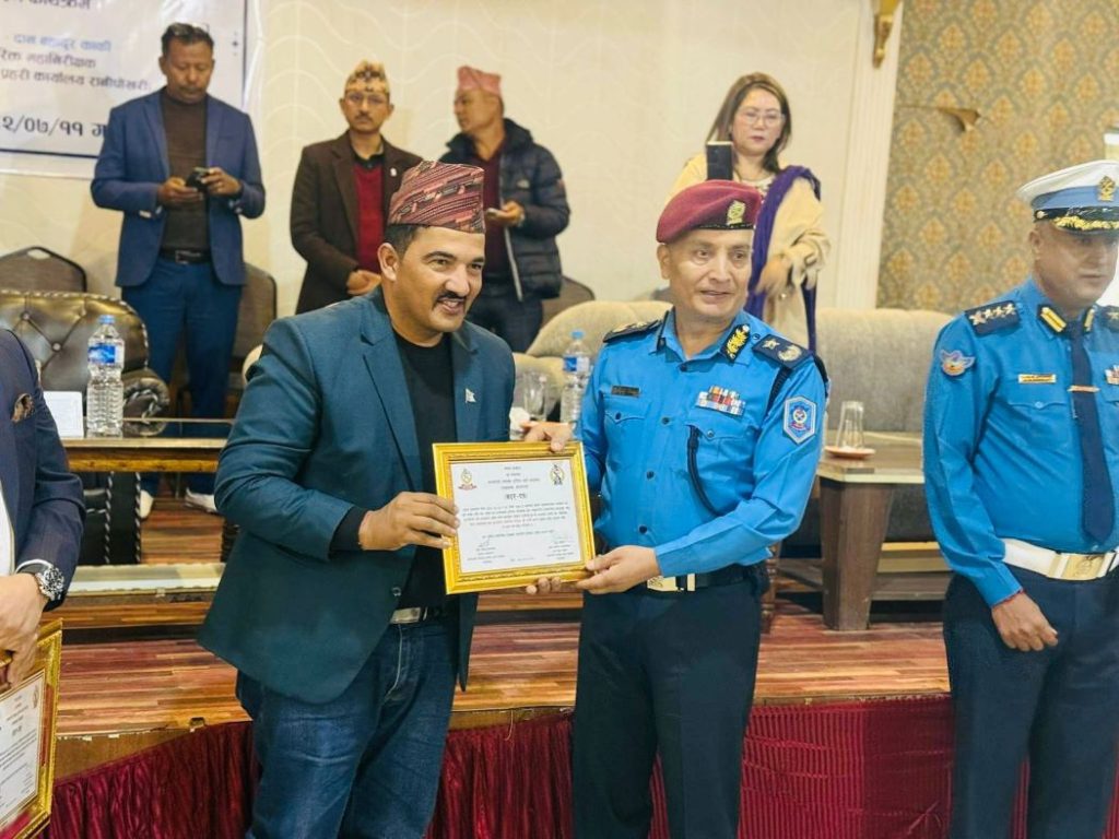 आज एक कार्यक्रमबीच प्रहरी अतिरिक्त महानिरीक्षक दानबहादुर कार्की र गैरआवासीय नेपाली सङ्घ (एनआरएनए) का अध्यक्ष महेशकुमार श्रेष्ठले संयुक्त रूपमा उहाँलाई प्रमाणपत्रसहित सम्मान गर्नुभएको हो । जेन्जी प्रदर्शनका क्रममा क्षतिग्रस्त काठमाडौँ उपत्यका ‘ट्राफिक कन्ट्रोल रूम’ पुनर्निर्माणमा सञ्चारमाध्यमका तर्फबाट उल्लेखनीय सहयोग पु-याएबापत उहाँलाई सम्मान गरिएको हो ।