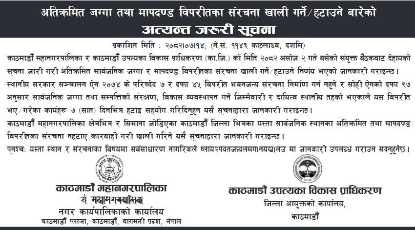 एक सार्वजनिक सूचना जारी गर्दै महानगरले असोज २ गतेको काठमाडौँ महानगरपालिका र काठमाडौँ उपत्यका प्राधिकरणको निर्णय अनुसार सात दिनभित्र अतिक्रमित जग्गा र मापदण्ड विपरीतका संरचना खाली गर्न अनुरोध गरिएको उल्लेख गरेको छ।