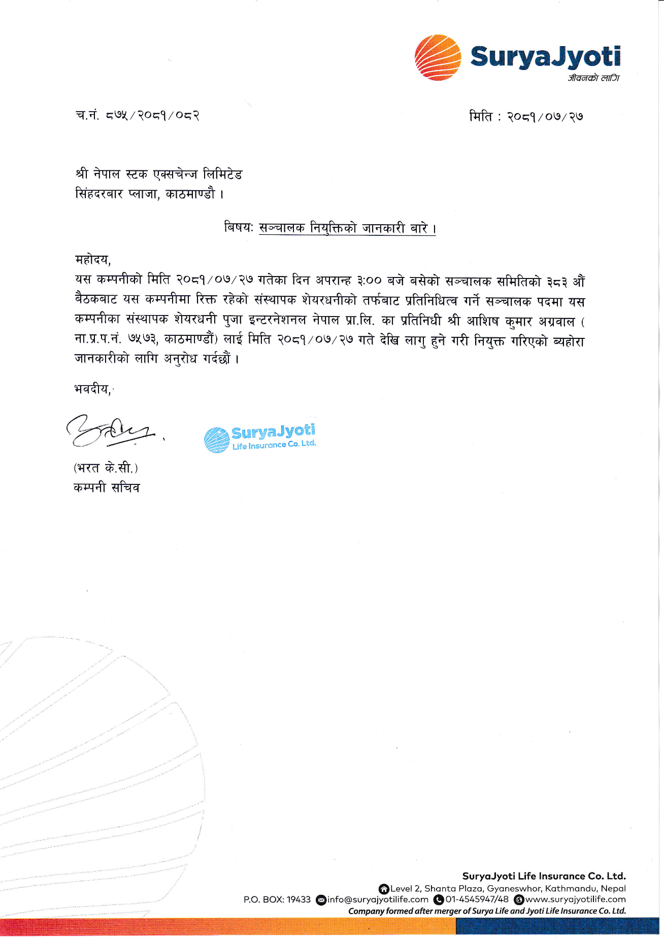 कम्पनीमा रिक्त रहेको संस्थापक शेयरधनीको तर्फबाट प्रतिनिधित्व गर्ने गरी पुजा इन्टरनेशनल नेपाल प्रा.लिको प्रतिनिधि अग्रवाल कात्तिक २७ गतेदेखि हुने गरि संचालकमा नियुक्ति गरेको कम्पनीले जनाएको छ ।